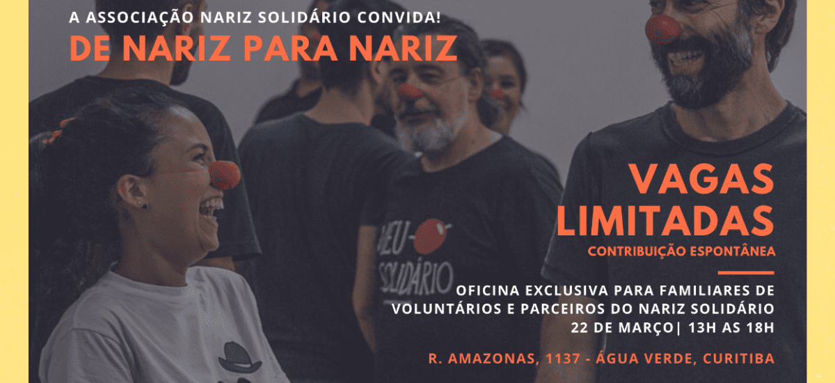 É com grande alegria que divulgamos a primeira oficina do Nariz Solidário “De Nariz para Nariz”, destinada aos nossos parceiros e familiares dos voluntários.O encontro que acontecerá no dia 22 de Março, das 13h às 18h, buscará compreender os impactos dos nossos trabalhos na realidade de cada voluntário, pela perspectiva de seu lar, promover também aos familiares dos voluntários e aos nossos parceiros maior proximidade com a causa e com o grupo.